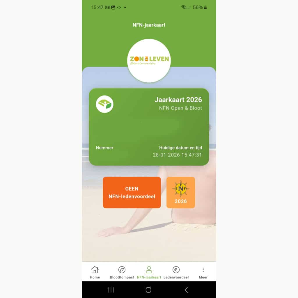 Voor de Digitale Jaarkaart maken we gebruik van de NFN Open & Bloot-app. Voor het activeren van de jaarkaart heb je je NFN-lidnummer nodig. Dit nummer staat vermeld in de e-mail die je onlangs ontvangen hebt.